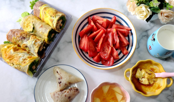 早餐六:牛奶、西柚苹果茶、鸡肉手抓饼、自制粽子、蜂蜜拌番茄、鸡蛋羹。