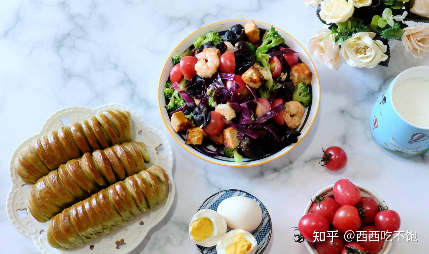 早餐七:纯牛奶、抹茶肉松面包、烤豆腐虾仁蔬菜沙拉、煮鸡蛋、小番茄。