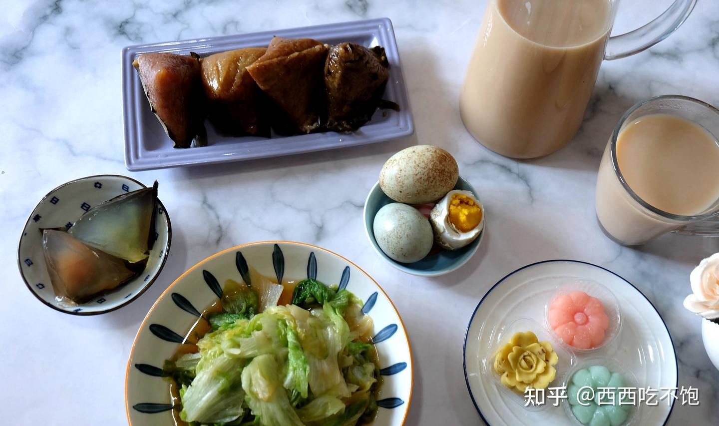 早餐三:咸奶茶、4种口味的粽子、甜品、咸鸭蛋、蚝油生菜。