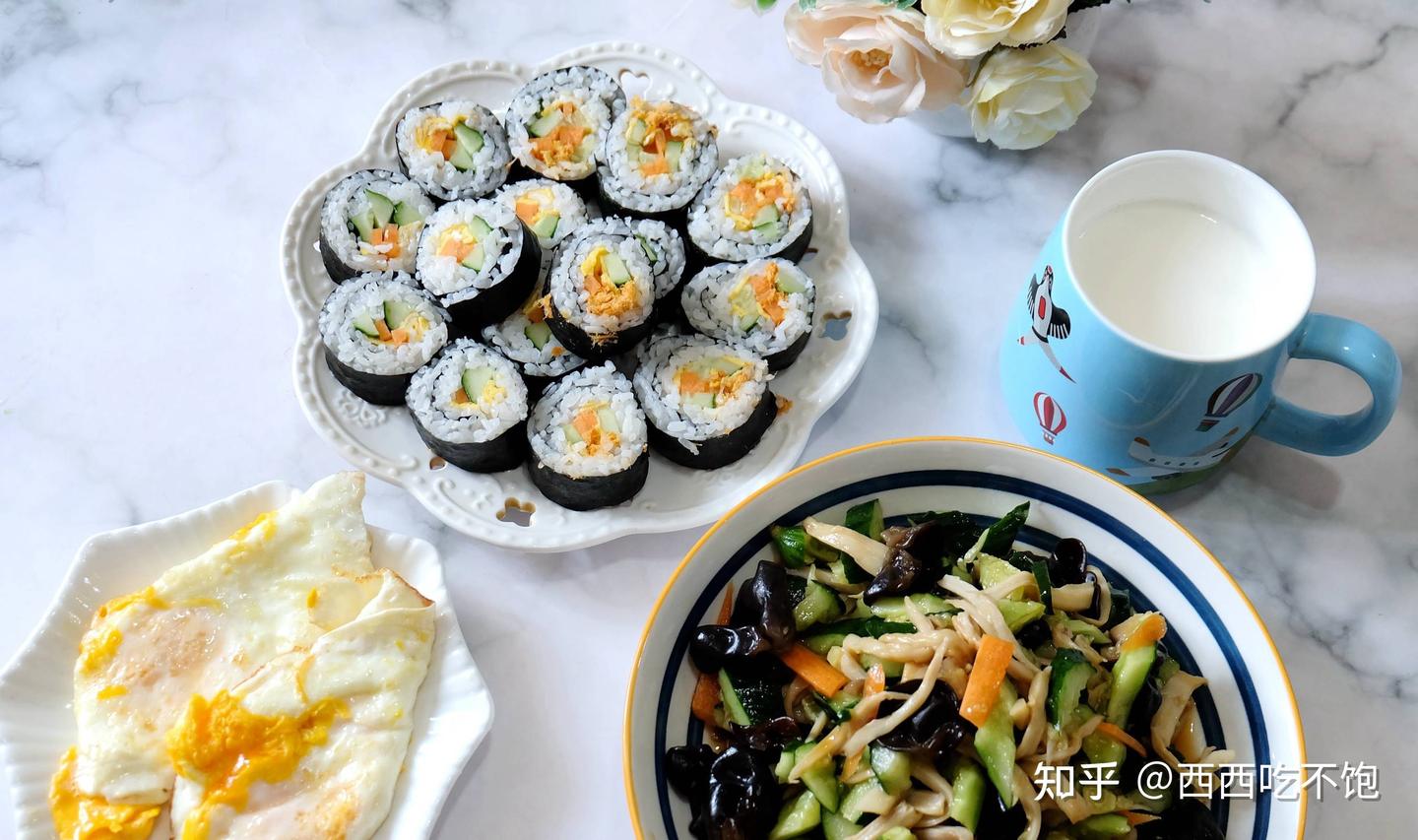 孩子说想吃紫菜包饭,早上起床后先把大米放进电饭锅里做米饭,木耳放在水盆里浸泡,再下楼晨练。晨练后回来继续做早餐,米饭也熟了。取一张紫菜,盛一碗米饭拌上寿司醋,铺在紫菜上,将准备好的鸡蛋饼、黄瓜条、胡萝卜条码在米饭上卷起来再切成小段,摆盘即可。其中一份紫菜包饭还放了豆松粉,有点像肉松的感觉。孩子们都挺喜欢吃的。