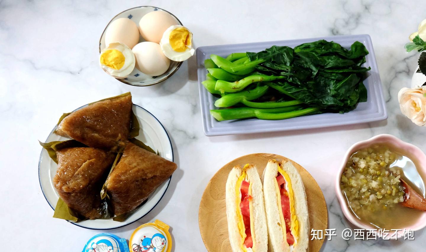 早餐四:绿豆麦仁粥、肉粽、煎蛋三明治,煮鸡蛋、白灼芥蓝、棒棒奶酪。